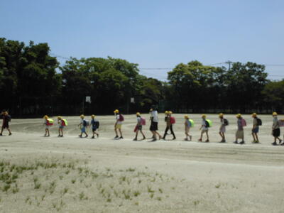 ( ↓ 本日の午後は、一斉下校です。日ざしも暑い中なので、通学班で集まり次第、すぐに下校しました。)
