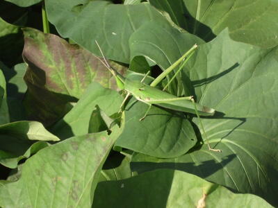 サツマイモの葉の上には、バッタがとまっています。