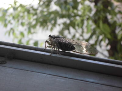 木の上では、まだたくさんの蝉の声が響いています。( ↓ 校舎のはじにセミがとまっていました。このあと元気に飛び去りました。)