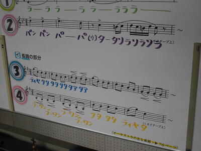 6年生の音楽室で音楽の授業です。ウイルス感染拡大防止のため、大きな声で歌ったり楽器を演奏したりすることをおこなわずに、映像や音楽を聴いて気がついたことなどをワークにまとめています。黒板や掲示物を工夫して授業をおこなっています。子供たちも集中して取り組んでいます。