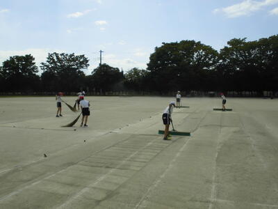 校庭では、運動会にむけて校庭の整備が始まりました。子供たちが校庭を掃いたり、雑草を抜いたりしています。
