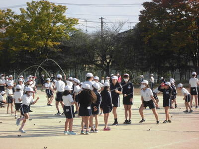 本日の昼は、「なかよし集会(異年齢による縦割り活動)」の時間でした。今日は、各グループごとに縄跳びをして楽しみました。どのグループも、上級生が下級生のお世話をしたり、縄跳びの方法やコツを教えてあげたりしながら活動しました。どの学年の子供たちも、笑顔で活動していました。