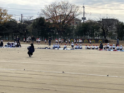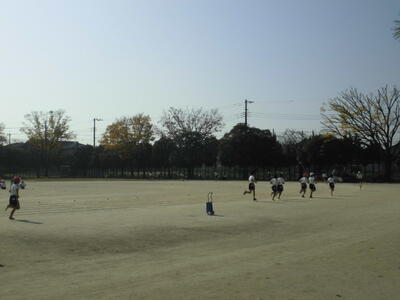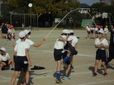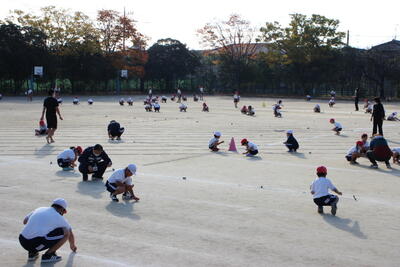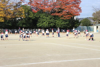 このあとの予定では、9:40~10:25 一・二年生、10:45~11:30 三・四年生、11:40~12:25 五・六年生の競技となります。