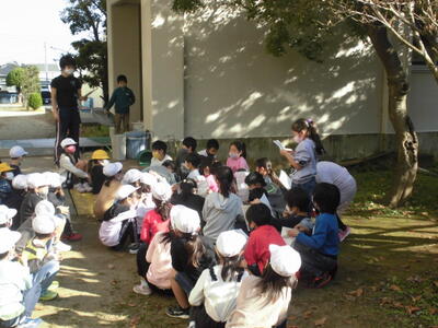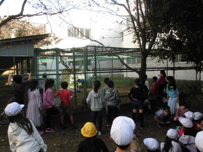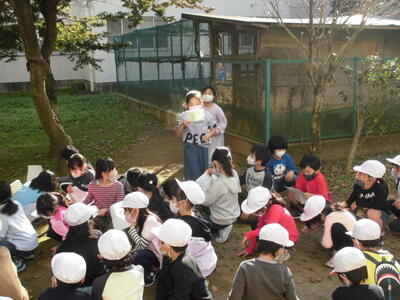 ウサギを世話する当番が、2年生から1年生に引き継がれます。12月の引継を前に、今日は2年生が1年生たちにウサギの世話の仕方を説明しました。