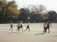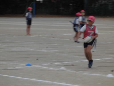 ↓ 4年生が、体育の授業でタグ・ラグビーをおこなっています。(ラグビーのルールに近いですが、タックルする代わりにボールを持った相手の腰のタグをとることで、攻撃を止められます。)