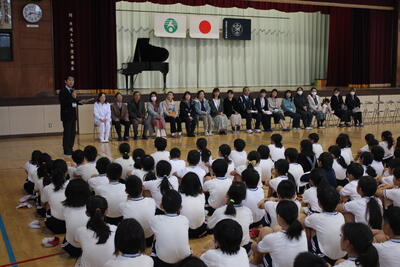 8:15 体育館で開会式です。密を避けて、児童間の間隔をあけています。校長先生の話や児童代表の決意の言葉がありました。