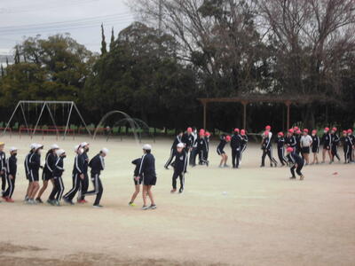 今日の朝は体育朝会でした。この時期は、クラスごとに長縄とびに挑戦しています。