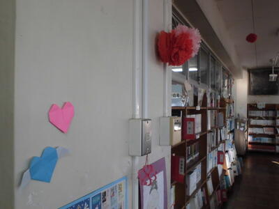 ( ↓ 2月をイメージして、たくさんのハートが飾ってあります。)