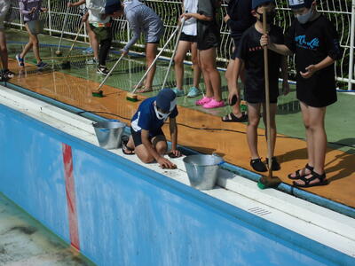 ( ↓ 5年生がプールの壁面や、プールサイドをきれいに磨いてくれています。)