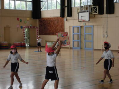 今朝のさわやかタイムは、放送でおこないました。教室のモニターを見ながら、手本の先生の動きに合わせてダンスをしました。