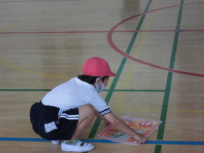 (体育担当の先生が、放送で、紙を使って「紙でっぽう」の作り方を、映像を流しながら実況して説明しました。)