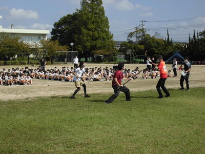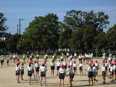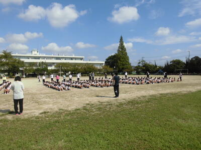 (不審者が警察に引き渡された想定で、全校児童が校庭に避難しました。)