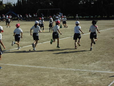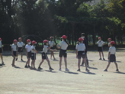 ( ↓ 4年生の体育です。リレーのバトンパスの練習をしています。声にあわせてバトンを受け取ります。)