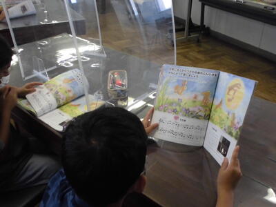 ( ↓ 一年生の国語の授業。くじら雲に乗って子供たちが空を飛ぶというお話を一生懸命に読んでいます。)