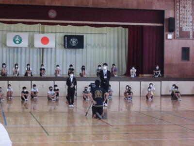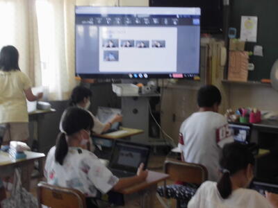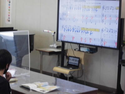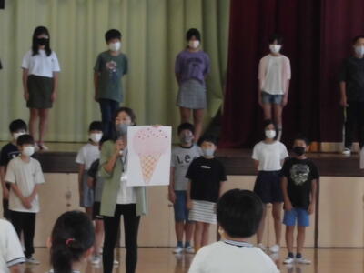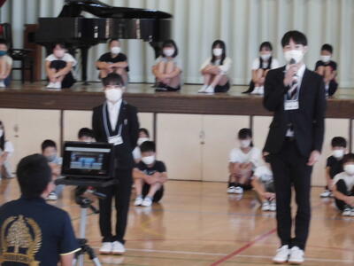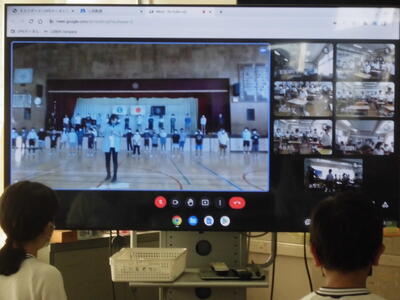 今日の朝は、音楽朝会。体育館で5年生が発表をしました。密を避けるため、体育館では2・3年生が鑑賞し、他の学年はリモートで教室のモニターで発表を鑑賞しました。