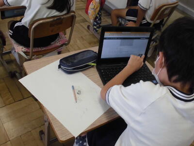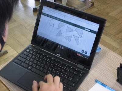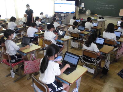 ( ↓ 4年生の総合的な学習の時間です。福祉の学習で、自分たちで調べた手話の指の動きを、タブレットで撮影して画像を先生のタブレットに送っています。)