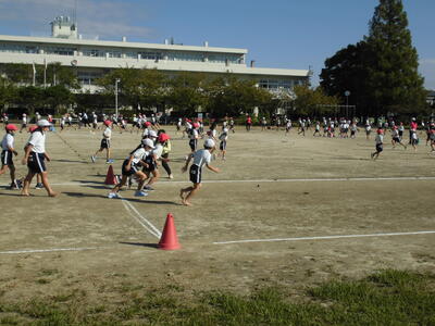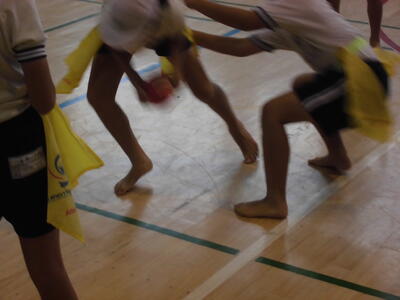 ( ↓ 3年生の体育の授業。タックルをする代わりに相手の腰のフラッグを取って動きを止めるフラッグフットボールに取り組んでいます。)
