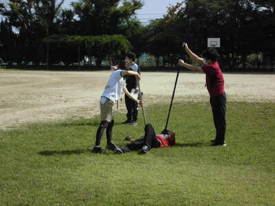(子供たちの安全を守るため、不審者侵入を止めたり、動きをおさえたりする教員の訓練もおこないます。)