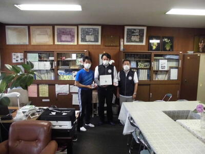 ライオンズクラブ様より、学校に消毒液を寄贈していただきました。学校を代表して校長先生が受け取りました。学校の安全のため、子供たちの健康のため、ありがたく使わせていただきます。