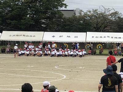 9:50 この後、全校児童による応援合戦・大玉送りです。ここまでほぼ予定通りですが、プログラムより10分ほど遅れています。