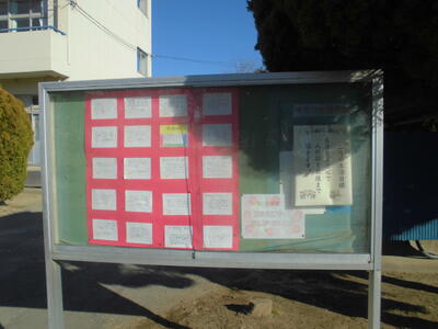 学校の玄関を入ってからの廊下は、「小渕っ子ギャラリー」の名前がついています。図工や書写の作品が展示されています。今の時期は、書きぞめの埼玉県展覧会に出展された作品が掲示されています。