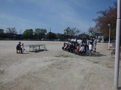 今日の朝は、今年度初めての音楽朝会でした。密をさけるため校庭で児童間の間隔をあけて、マスク着用でおこないました。全員で校歌の練習をおこないました。