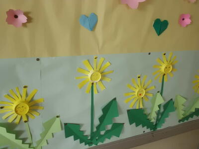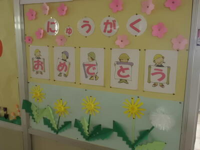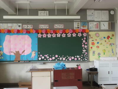 ( ↓ 入学した新1年生の教室の掲示。今の新2年生が昨年のうちに作っておいた掲示物を、新6年生が飾ってくれました。)