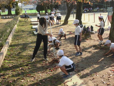※現在、学校の枯れ葉が多く落ちて、毎日、児童や職員で落ち葉掃きをしています。学校の外に出てしまう落ち葉も校務員さんが掃き集めていますが、次々と葉が落ちます。今後も、落ち葉掃きを続けていきます。