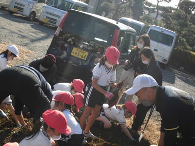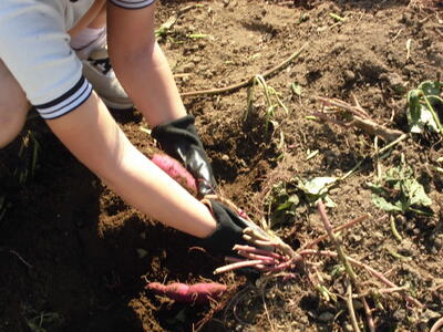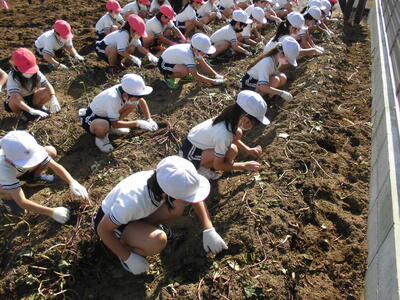 最初に3年生が掘り始めました。学校でのイモ掘りも3回目となり、どんどんイモを見つけて掘っていきます。