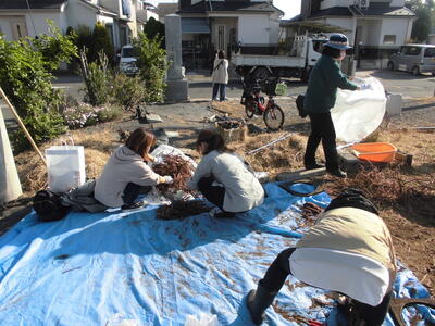 ( 午前中に校務員さんと教務主任の先生で、ツルのほとんどを切りました。先生たちでツルを集めています。)