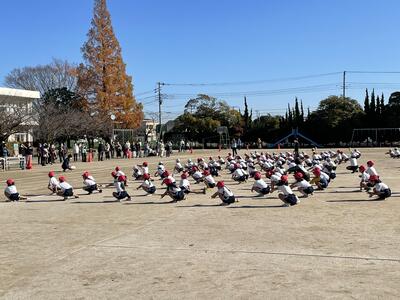 8:40 低学年が校庭に集まりました。準備運動などを行って、1年生からスタートします。