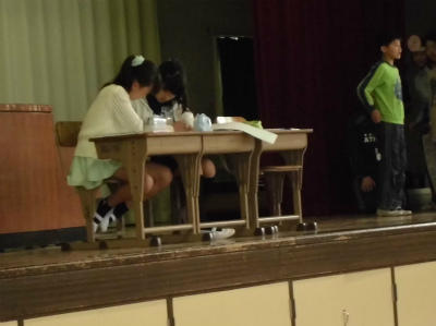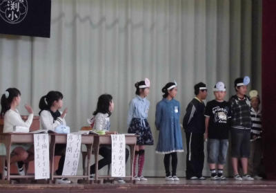 次に、今月の生活目標について、6年1組の子どもたちが、寸劇仕立てで全校児童に伝えてくれました(写真)。