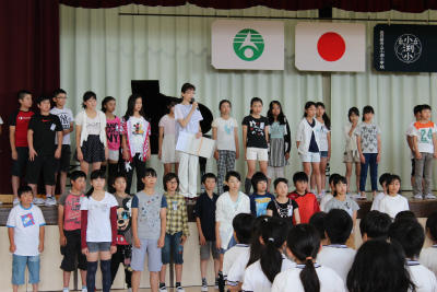 まずは全校児童による合唱。今月の歌「ドンマイ」を歌いました。元気な歌声が響き渡りました。