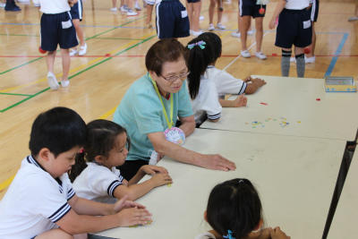 「松寿会」のみなさんに御協力いただき、けん玉、おはじき、あやとり、羽子板、めんこ、コマなど、昔の遊びを体験しました。