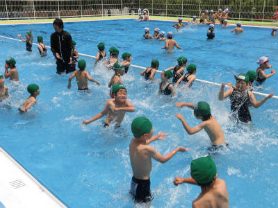 こちらは1年生、きれいに修繕を終えたばかりのプールで気持ちよさそうです