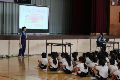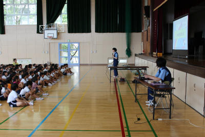 6年1組の山本さん、5年1組の勝田さんから、水泳の授業に向けての目標を発表してもらいました。谷体育主任からは、授業に参加する際の注意点や目標についてのお話がありました。
