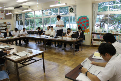 授業後は、全職員で研究協議、その後、文教大学准教授の石井先生に御指導をいただきました。