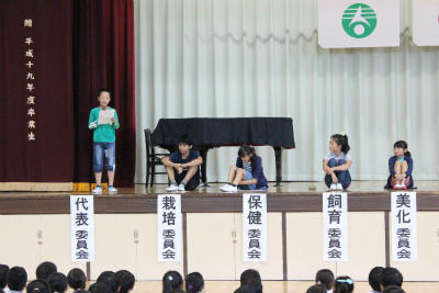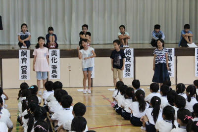 朝、小渕小の委員会活動について紹介する児童朝会を行いました。小渕小には、代表・栽培・保健・飼育・美化・掲示・給食・運動・図書・放送と、計10の委員会があります。