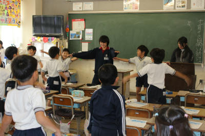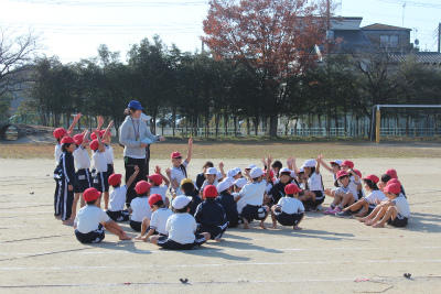 職場体験で実習に来ている中学生にリードしてもらい、多くの小渕っ子1年生が自己記録を更新しました。