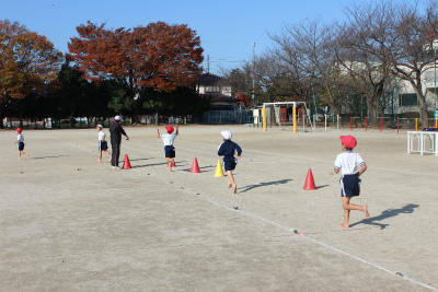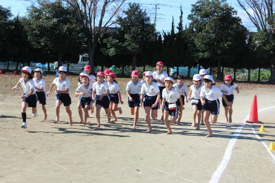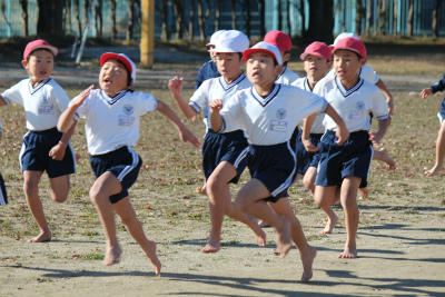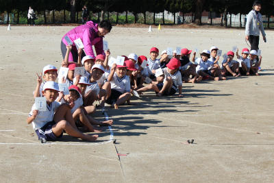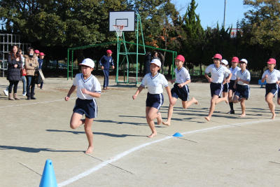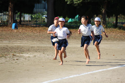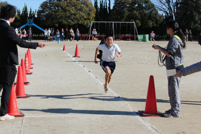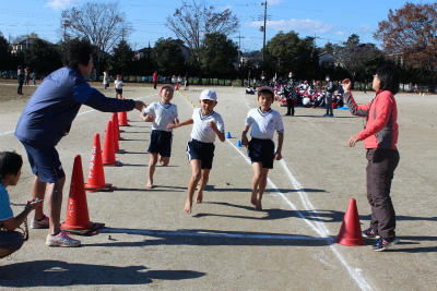 学年ごとにスタートする時間をずらすハンディ付きのレースです。結果は男女とも6年生チームの貫禄勝ち、さすがです。特に女子のレースは、アンカーがフィニッシュライン直前で逆転する白熱のレースでした。