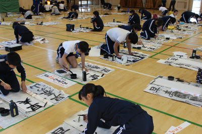 書き初めの競書会を実施しました。これまで練習してきた成果を発揮すべく、集中して取り組む小渕っ子です。