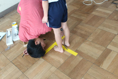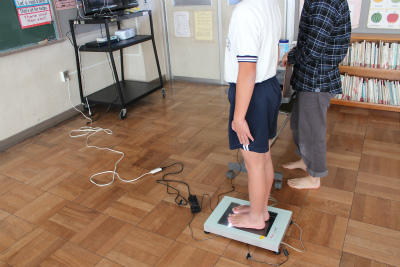 すあし(はだし)の活動と心身との関係について研究している中京大学スポーツ科学部の金子先生の要請を受け、小渕小学校の子どもたちにも協力をしてもらいました。