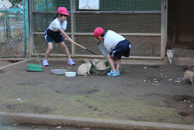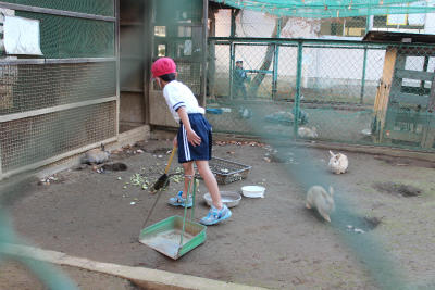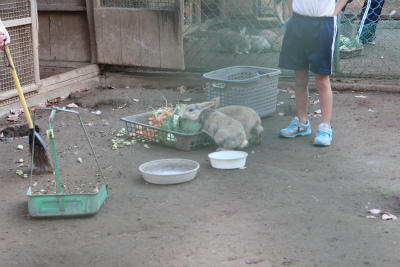 朝、当番の児童がウサギ小屋を開け、まず掃除、そして、エサになる野菜の切れ端などをえさ用の平たいかごに盛りつけ?!てくれました。
