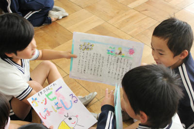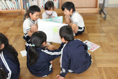 2年生が、国語の学習で作成した自分だけの「本」を後輩の1年生に読んで聴かせる取組をしました。いつもは、読み聞かせボランティアの方々に本を読んでもらっていますが、今日は全く逆の立場です。1年生への挿絵の見せ方なども工夫しながら、丁寧に読み聞かせをすることができました。