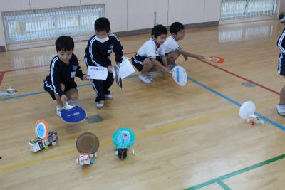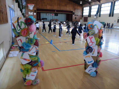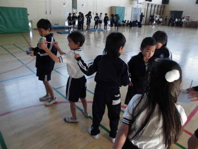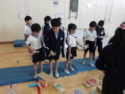 2年生が遊び用具(おもちゃなど)を制作し、それらを集めて体育館に「あそびの国」をつくりました。そして、その「あそびの国」に1年生を招待、1年生は、2年生がつくった様々な遊び用具を使って楽しく遊ぶことができました。