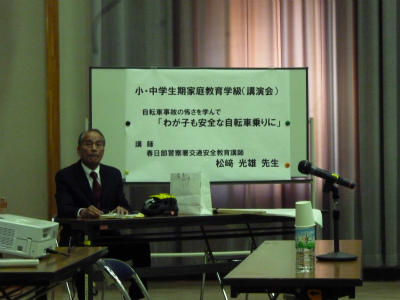 今年度は、春日部警察署から交通安全教育講師の松崎光雄先生をお招きし、「自転車事故の怖さを学んで『わが子も安全な自転車乗りに』」という演題で講義をしていただきました。
