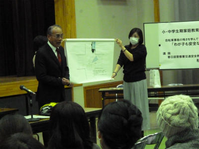 自転車運転者としての子どもにかかる責任の問題や事故の被害者にも加害者にもならないために注意しなければならないこと、また、大人が自動車を運転しているときのドライバーとしての注意点など、解りやすく講義していただきました。