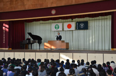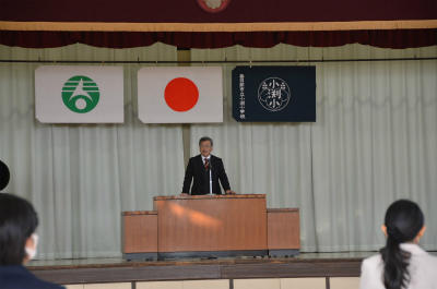 ①校長より「人に優しい仲間を大切にする小渕っ子になってほしい」というお話