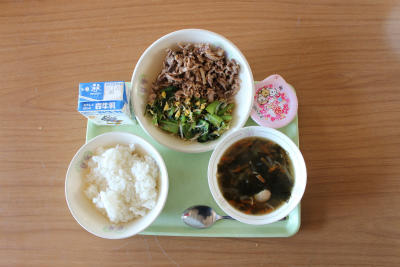 今日は、今年度最後の給食でした。メニューは、ビビンバ、わかめスープ、牛乳、いちごゼリーでした。子どもたちも大好きなメニューで、あっという間にたいらげていました。