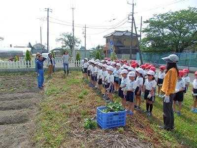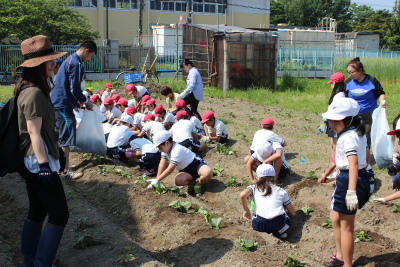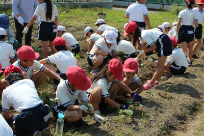 さすが3年生! これまでの経験も活かしながら、手際よく苗を植えていきます。すでに畑には、雑草が生え始めていましたが、これも3年生が取り除いてくれました。